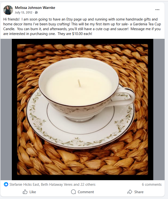 I’m a mom of two sweet daughters. I’m slightly addicted to tennis and Diet Dr. Pepper! And years ago, I poured one candle into a vintage teacup and posted a picture of it to Facebook. Back then, my little business was called Wicks & Willow.